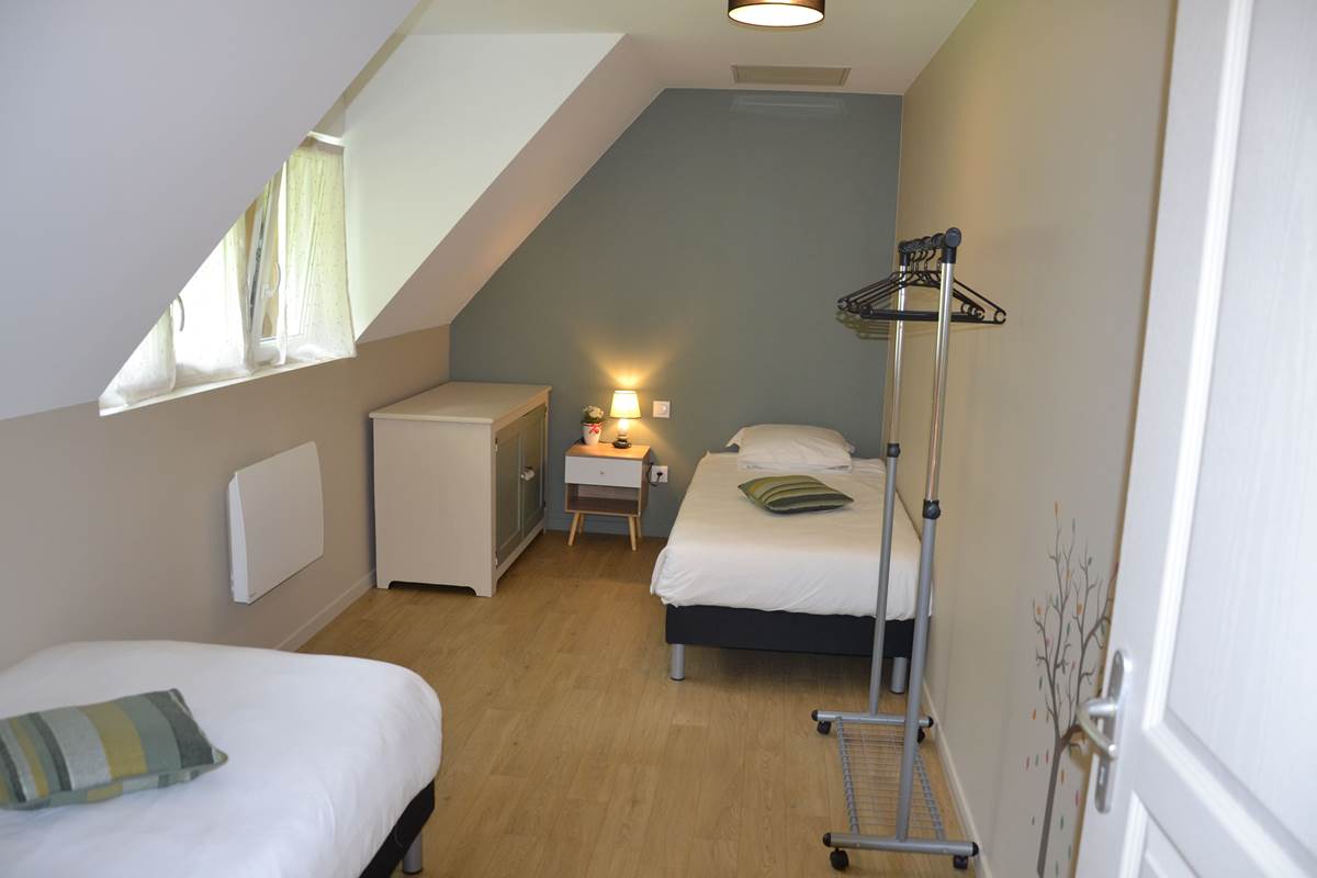 2 lits simples (90 x 200), pouvant être accolés pour recevoir un couple (180 x 200 avec sur-matelas), couettes, oreillers, housses de protection et alèses. Chauffage électrique, fenêtres avec double vitrage, volets électriques, 2 tables et lampes de chevet, 1 meuble de rangement. Portant et cintres. Détecteur de fumées. Vue nord-ouest sur ancien étang.
